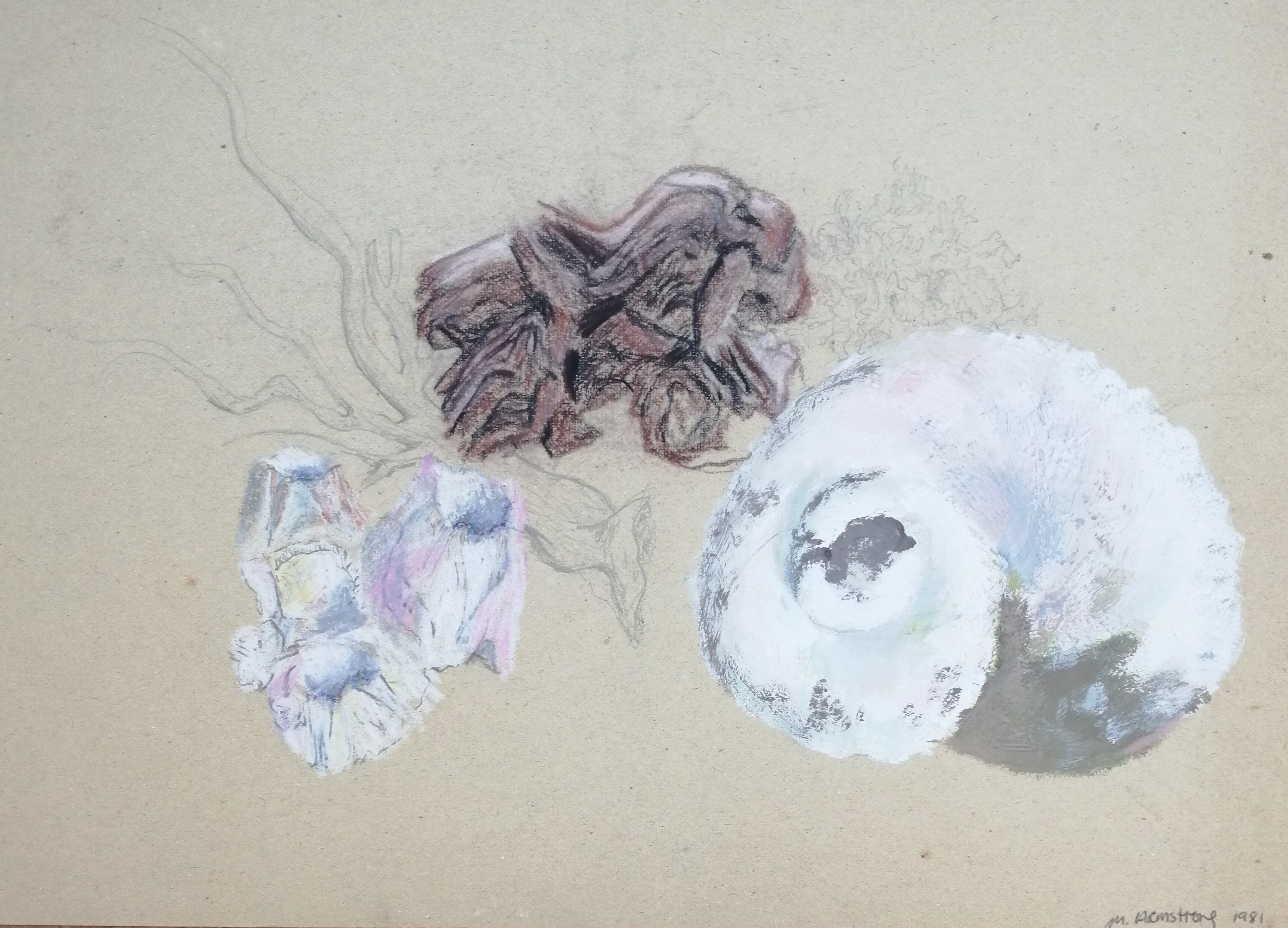 I created this mixed media image in 1981 (oil pastel, charcoal and conte’, and acrylics). I was unmarried at the time and was Morag Armstrong. The guide lines were to show the light and shadows on white objects and one dark object. The still life was set out: two white shells, one white natural sponge, one white piece of coral and one dark piece of wood. I never finished it but every time I looked at it over the 39 years I would think it was a pity that I had never finished it because it had potential. I had felt constrained at the time by the ‘rules’ because I didn’t know what medium to use for the coral and sponge. I didn’t know if I had it in me to create what I wanted and I was ignorant of certain materials.