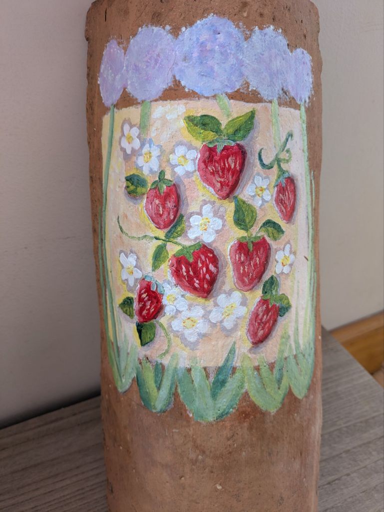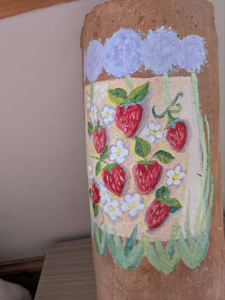 If you are wondering where this post is leading to… This is exactly what my life feels like: all meaningful but crazy too. In all the craziness I have been working on a painting for my strawberry patch. It’s just about finished. Once I have varnished it I will put it out in my patch.