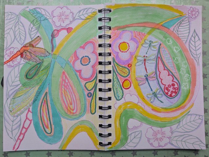I draw dragonflies and more leaves slowly in a meditative fashion. It is done over two days, not all at once but each time I needed a quiet space. In the end I think of the values I would want on our planet.